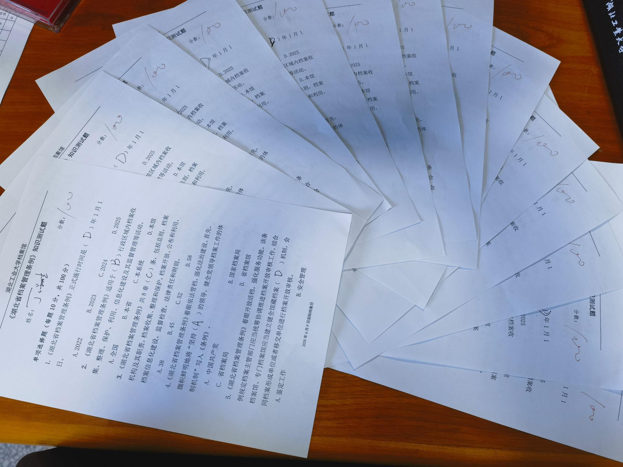 国际档案日当天,档案馆还组织全校档案专兼职人员收看国家档案局6·9国际档案日线上专题讲座《人民的选择 历史的必然——中国共产党在抗日战争中是怎样应得战争赢得人民的?》和“湖北省档案馆开放日”活动“请听档案说”特别直播《追寻楚脉》,并编发了最新版《湖北工业大学档案宣传学习资料》,同时,在档案馆内部举行了《湖北省档案管理条例》知识测试。