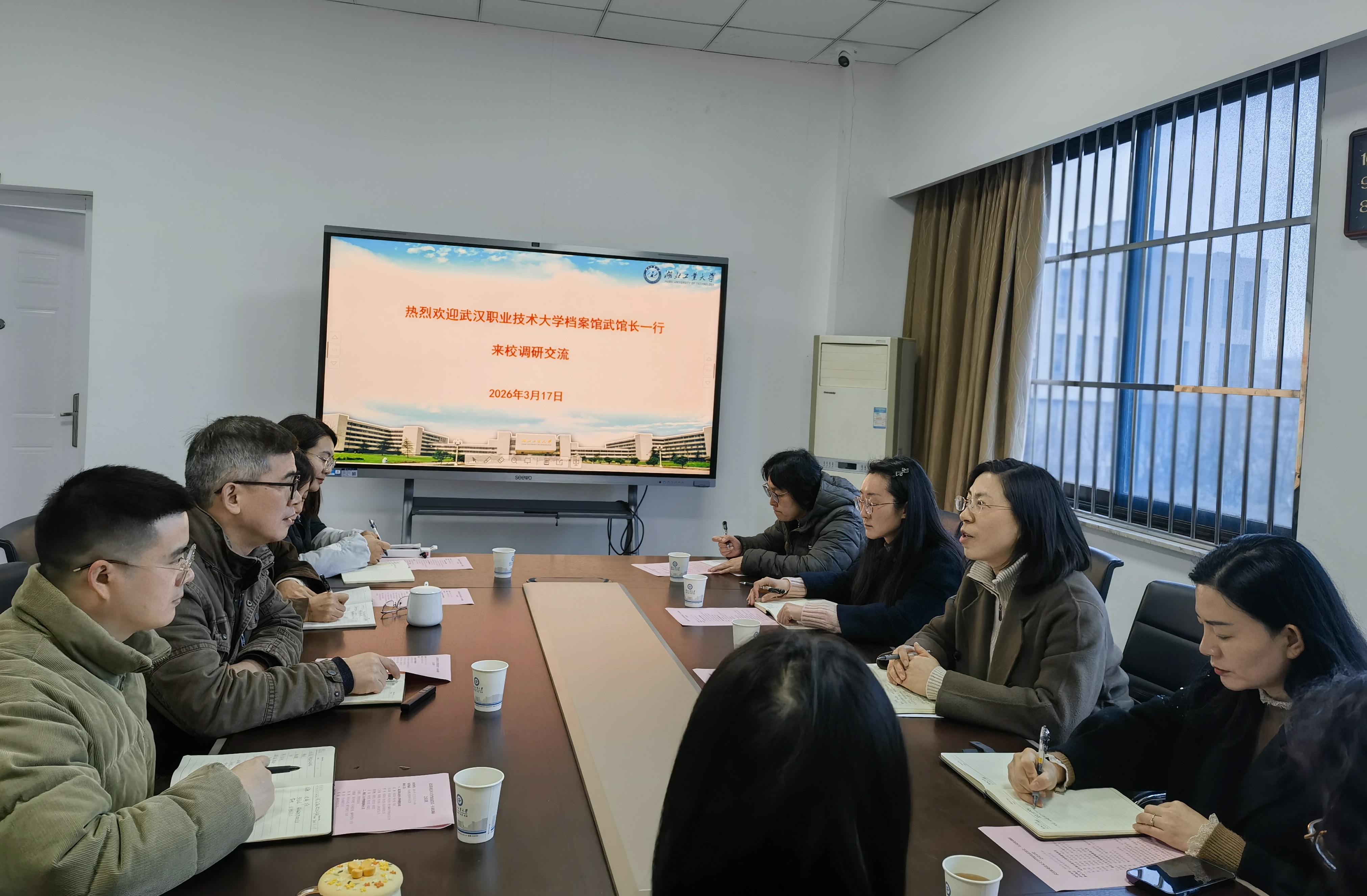 3 月 17 日上午,武汉职业技术大学档案馆馆长武静一行 6 人莅临学校,就档案工作开展专题调研。学校档案馆副馆长吕建兵主持调研座谈会,档案馆相关科室负责老师参加了调研。